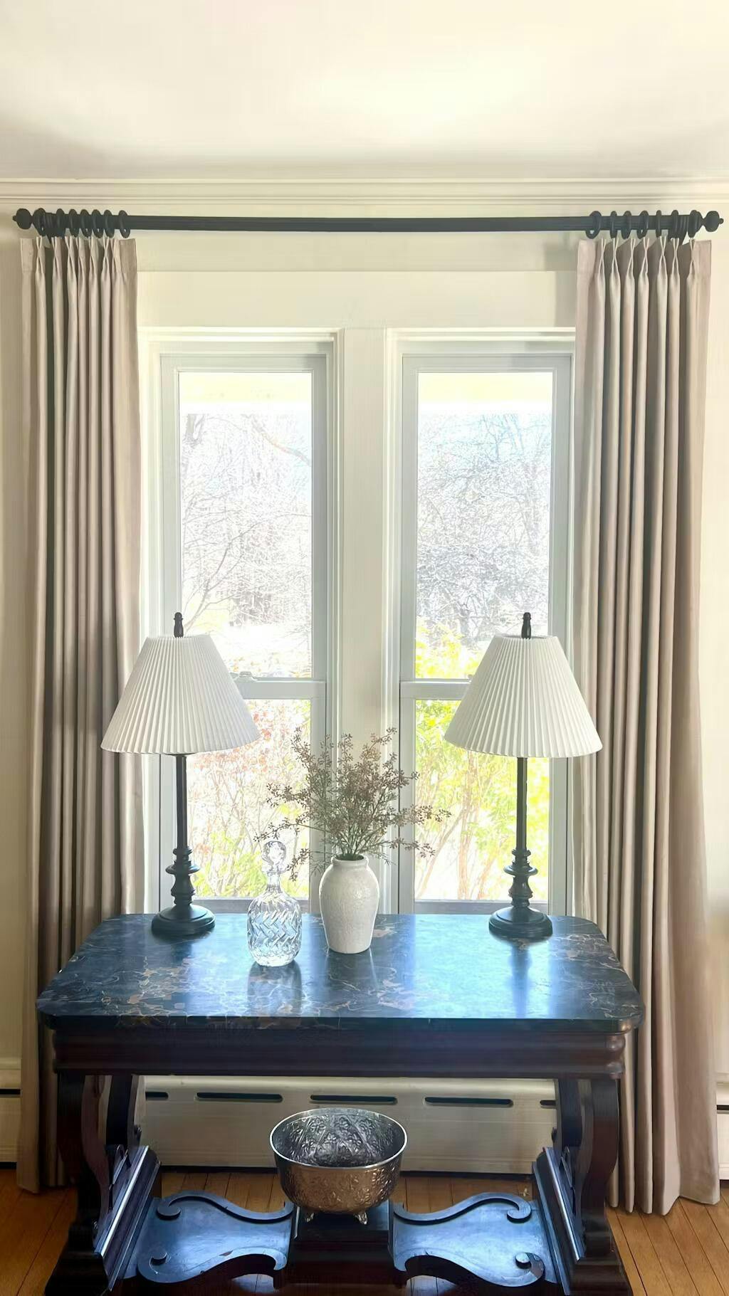 For a tailored, clean, and contemporary finish, raise the hems ¼ inch above the floor.