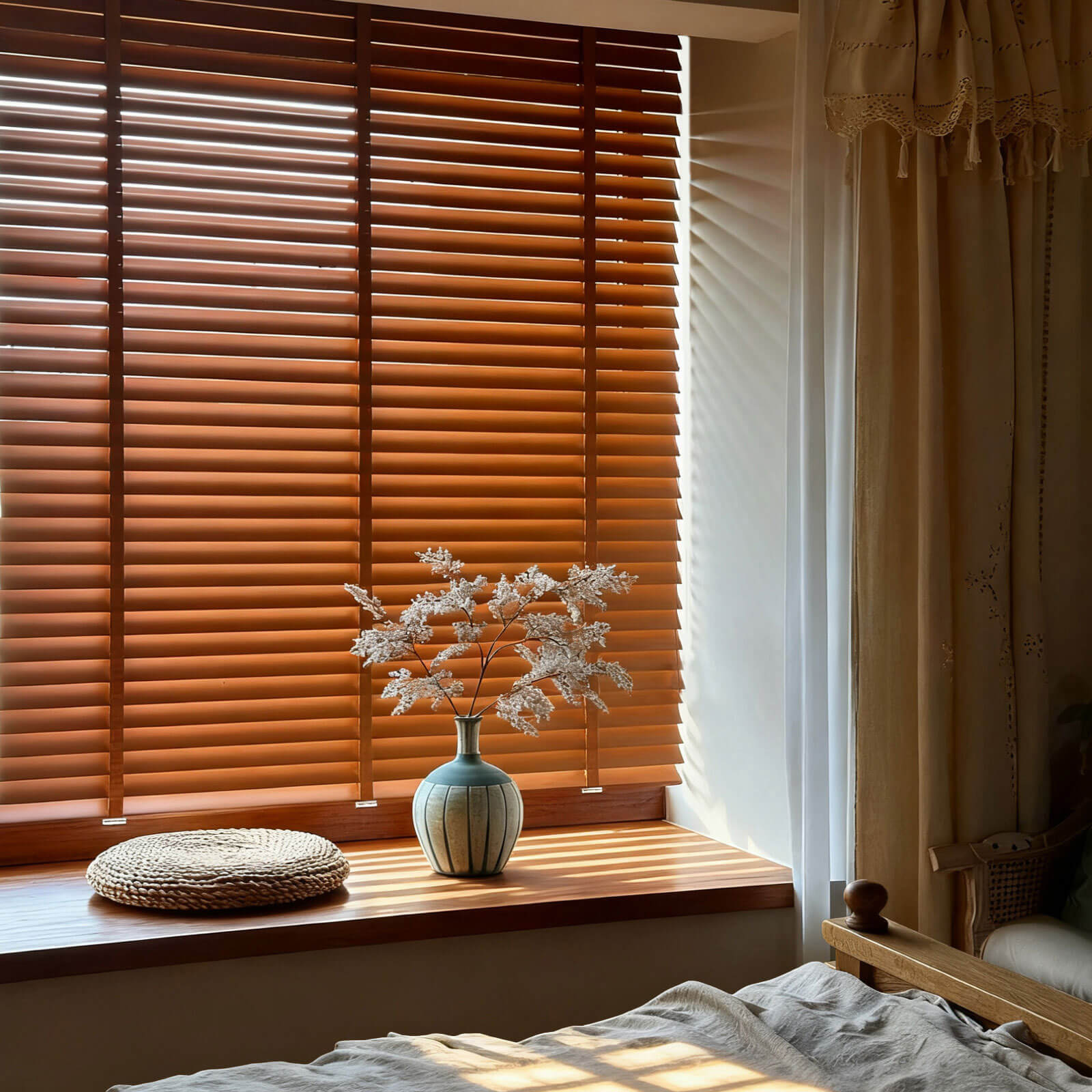 Crafted to echo the warmth of nature, our faux wood blinds bring organic texture into your space, without the upkeep. Whether you're styling a sunlit kitchen or a calm, contemporary study, each slat reflects quiet elegance and enduring function. A seamless blend of natural charm and modern resilience.