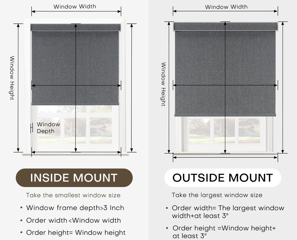 Shades are installed over the window on brackets attached to the wall or window frame. We recommend adding a minimum of 2-4 inches to your width and 10-12 inches for height measurements to allow for light gap coverage.