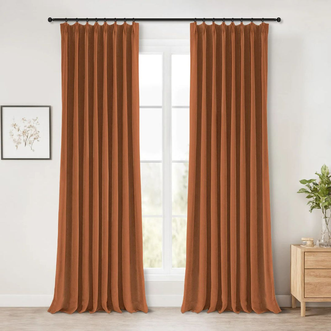Tailor pleats are more gathered than other headings and have permanent sewn-in pleats. Panel width is the width that pleats already set. It works for the track, traverse rod, channel rod, and pole with rings.