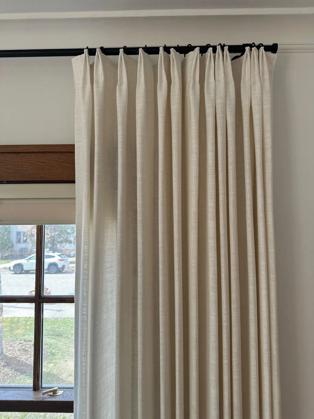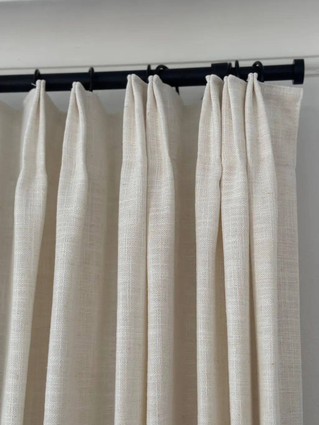 Please check if your curtain rings are twisted 180 degrees. Twisted rings can cause the pleats to twist, making the curtains look uneven. Before hanging the curtains on the rod or track, ensure all pleats are aligned in the same direction. Proper installation will help the memory training effect show neatly.