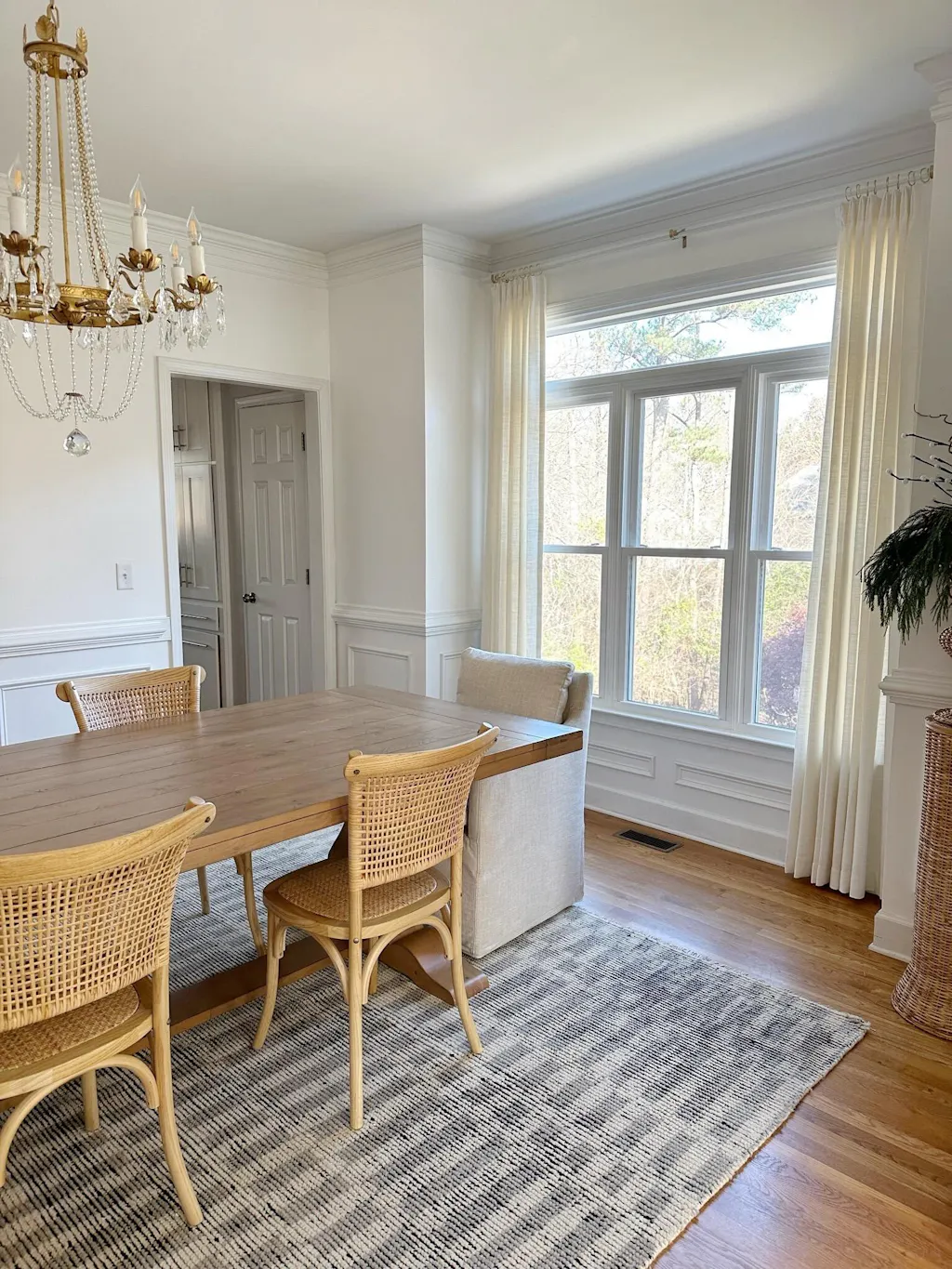 For a tailored, clean, and contemporary finish, raise the hems ¼ inch above the floor.