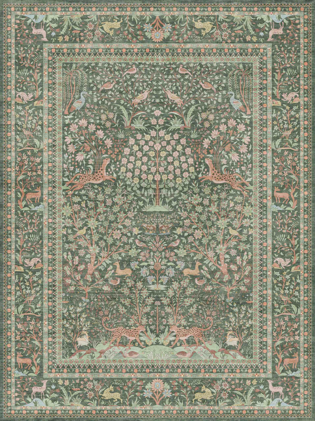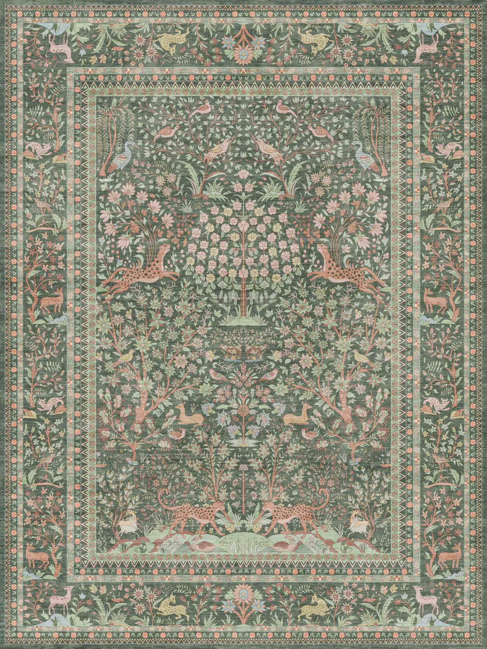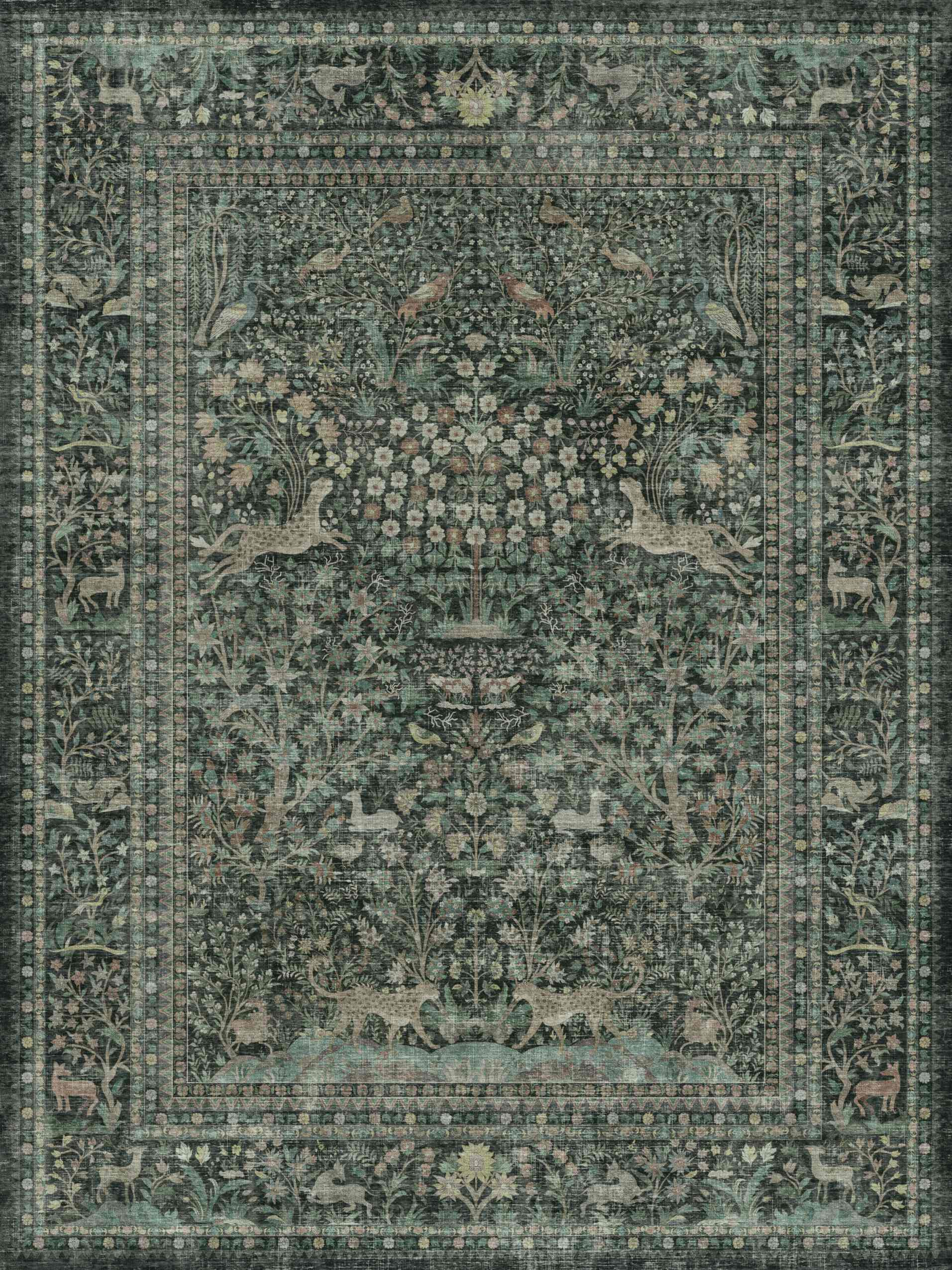 An ode to the serene soul of nature. The Lynn collection draws inspiration from the tranquil depths of forest springs and the intricate beauty of antique brocade. Each rug is a harmonious universe of ornate motifs, where delicate florals and scrolling vines intertwine in a classical dance. The palette moves from the delicate blush of a blooming peach grove to the profound stillness of a jade-dark pool, each hue evoking a different facet of a timeless landscape.