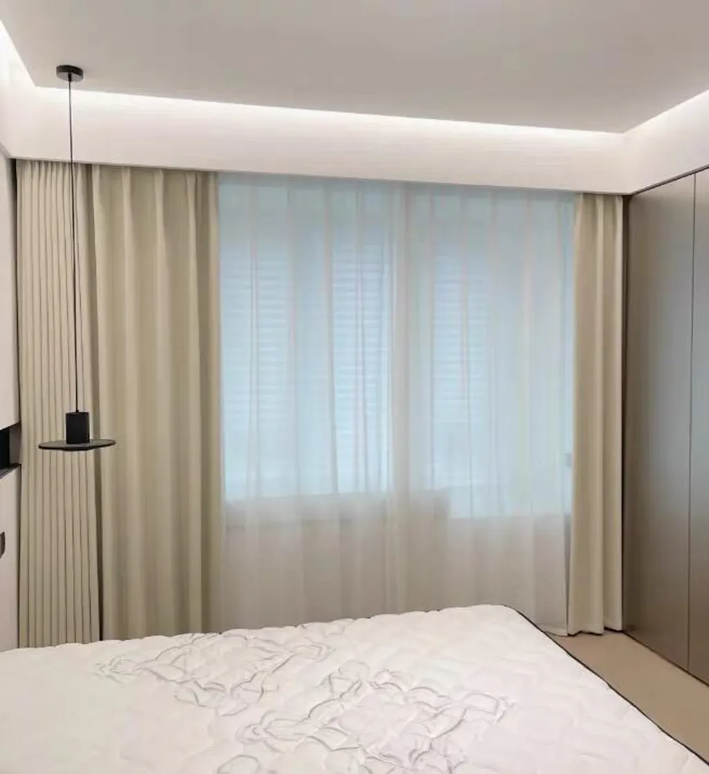 Of course, if you’d like, you can install double-layer curtains: a sheer layer plus a blackout layer. During the day, you can use the sheer curtains to block visibility, and for afternoon naps, the blackout curtains can create a completely dark environment, so that your sleep won’t be disturbed by light.