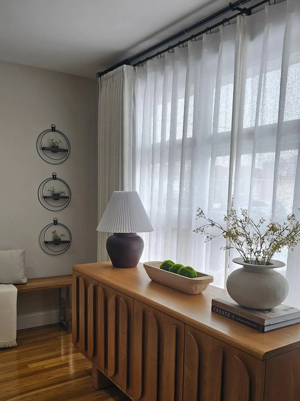 Of course, if you’d like, you can install double-layer curtains: a sheer layer plus a blackout layer. During the day, you can use the sheer curtains to block visibility, and for afternoon naps, the blackout curtains can create a completely dark environment, so that your sleep won’t be disturbed by light.