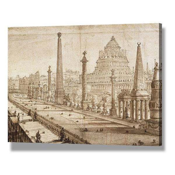 Imaginary Appearance of the Ancient Capitol is a masterful etching where Giovanni Battista Piranesi unleashes his wildest architectural fantasies on Rome’s legendary Capitoline Hill. Towering temples, colossal statues, and dramatic staircases rise in impossible grandeur, blending reality with dreamlike exaggeration. It’s not a historical record but a bold vision of Rome’s eternal dominance — a cityscape that commands respect, awe, and just a hint of intimidation. Piranesi’s play with scale and shadow turns the Capitol into a monumental throne room for empire and power.