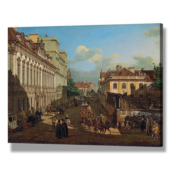 Miodowa Street is a masterful urban scene by Bernardo Bellotto, capturing the lively bustle and architectural rhythm of one of Warsaw’s historic streets. His razor-sharp detail brings to life the buildings’ facades, cobblestones, and busy figures, while the balanced composition and soft light give the scene a vibrant yet timeless feel. Bellotto’s work here is both a documentary and a love letter to city life.