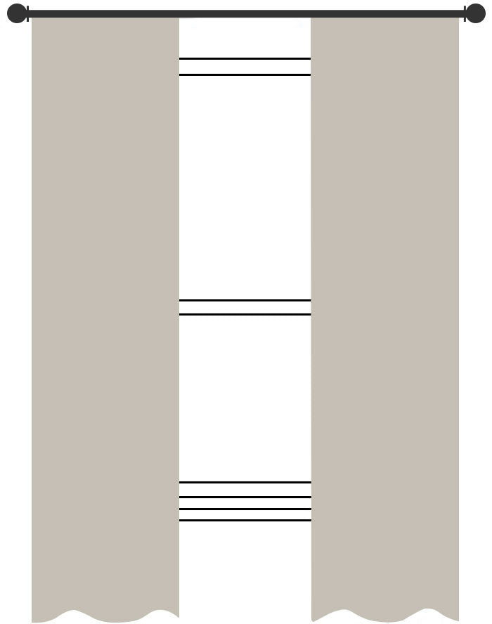 It creates a formal and elegant look. French Pleats are more gathered than other headings and have permanent sewn-in pleats for a more luxurious look. It works for the track, traverse rod, channel rod, and pole with rings.