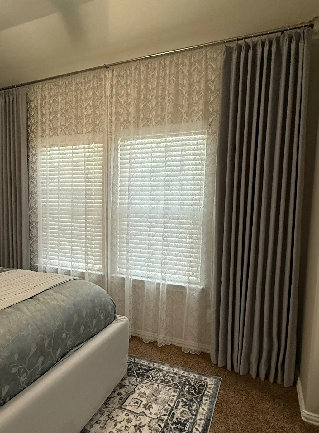 You will need to purchase a set of sheer curtains, a set of blackout curtains, and a set of double-track/double-rod curtain rods.