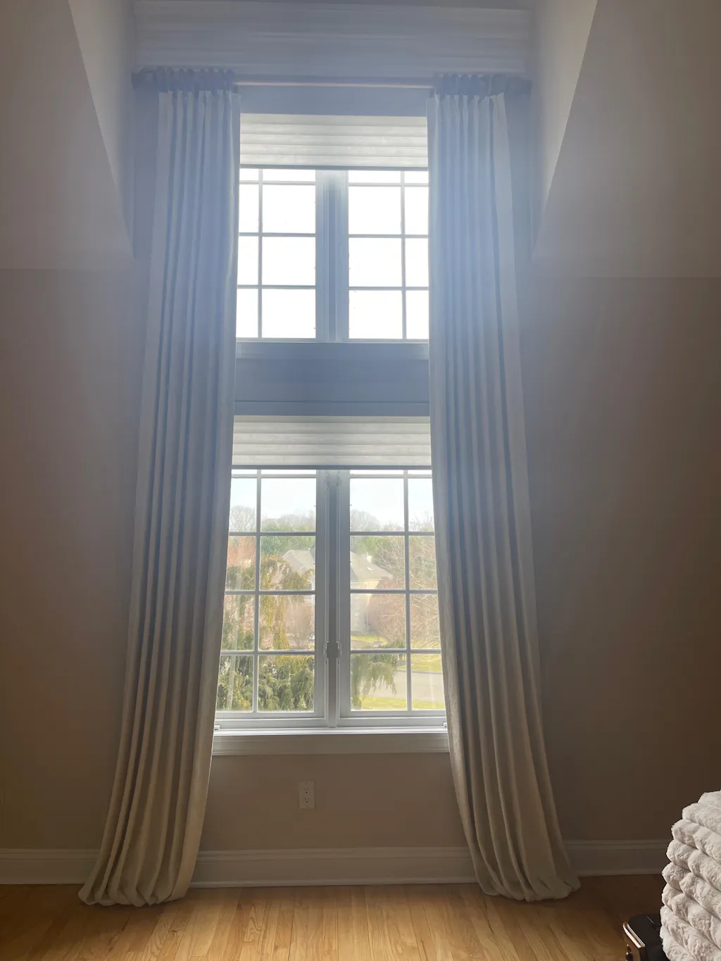 For a tailored, clean, and contemporary finish, raise the hems ¼ inch above the floor.